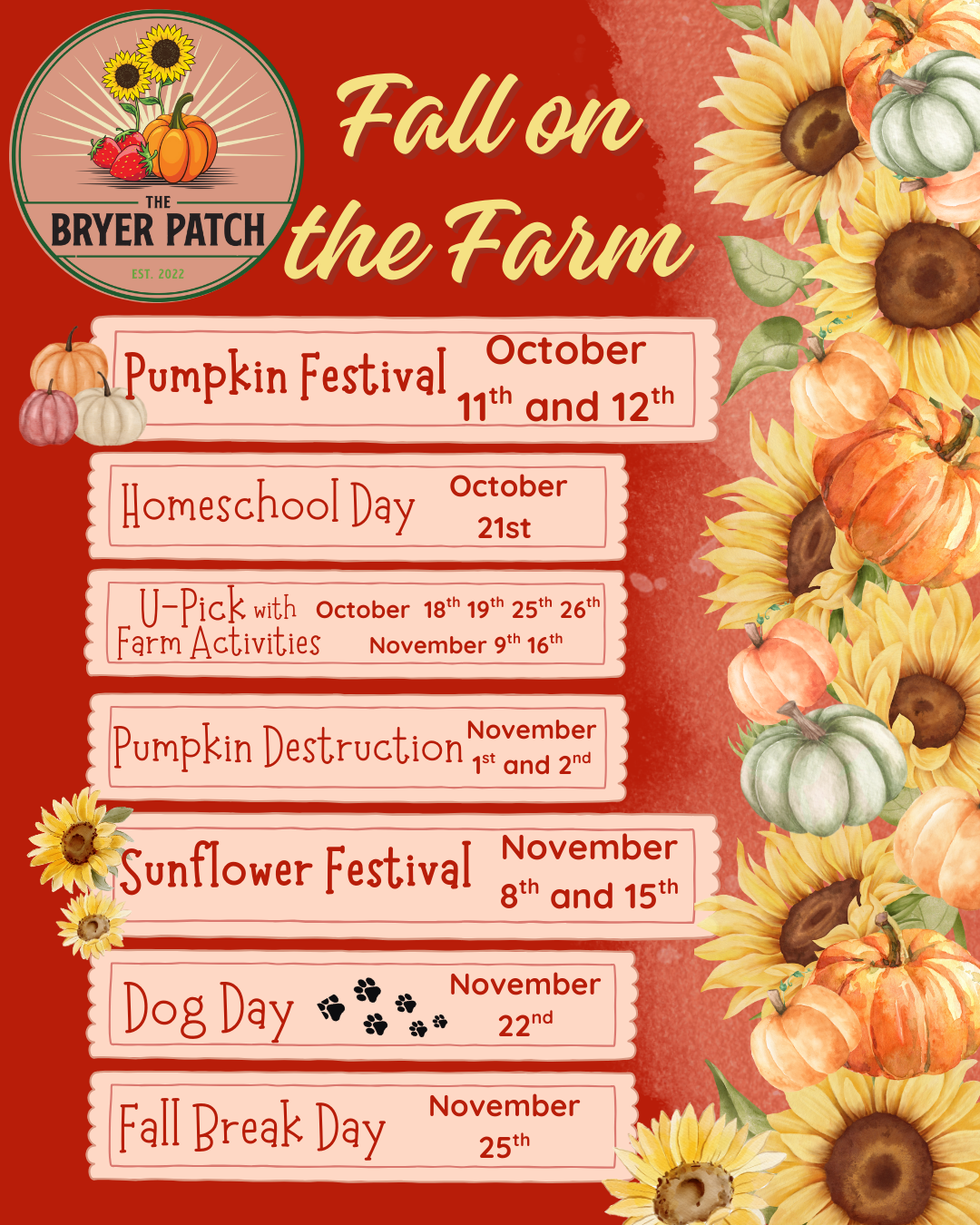 Special events include FALL ON THE FARM (October-November), the PUMPKIN FESTIVAL (October), and our SUNFLOWER FESTIVAL (November).